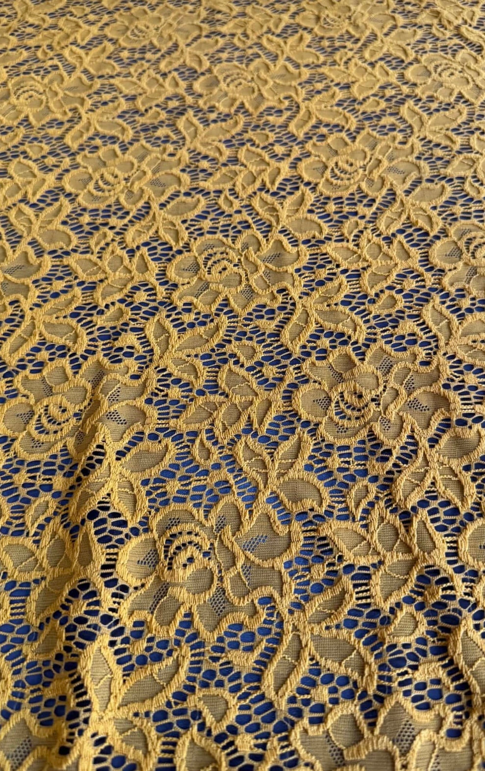 Robe midi en dentelle confectionnée avec soin, d'un jaune moutarde vif, à la silhouette évasée élégante. Elle est ornée d'un collier de fleurs original et d'un dos nu sophistiqué. Disponible sur commande dans différentes couleurs pour s'adapter à vos préférences.