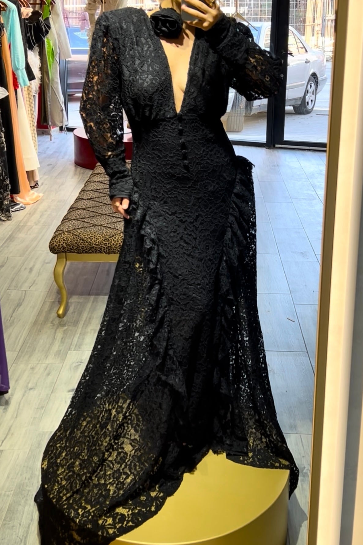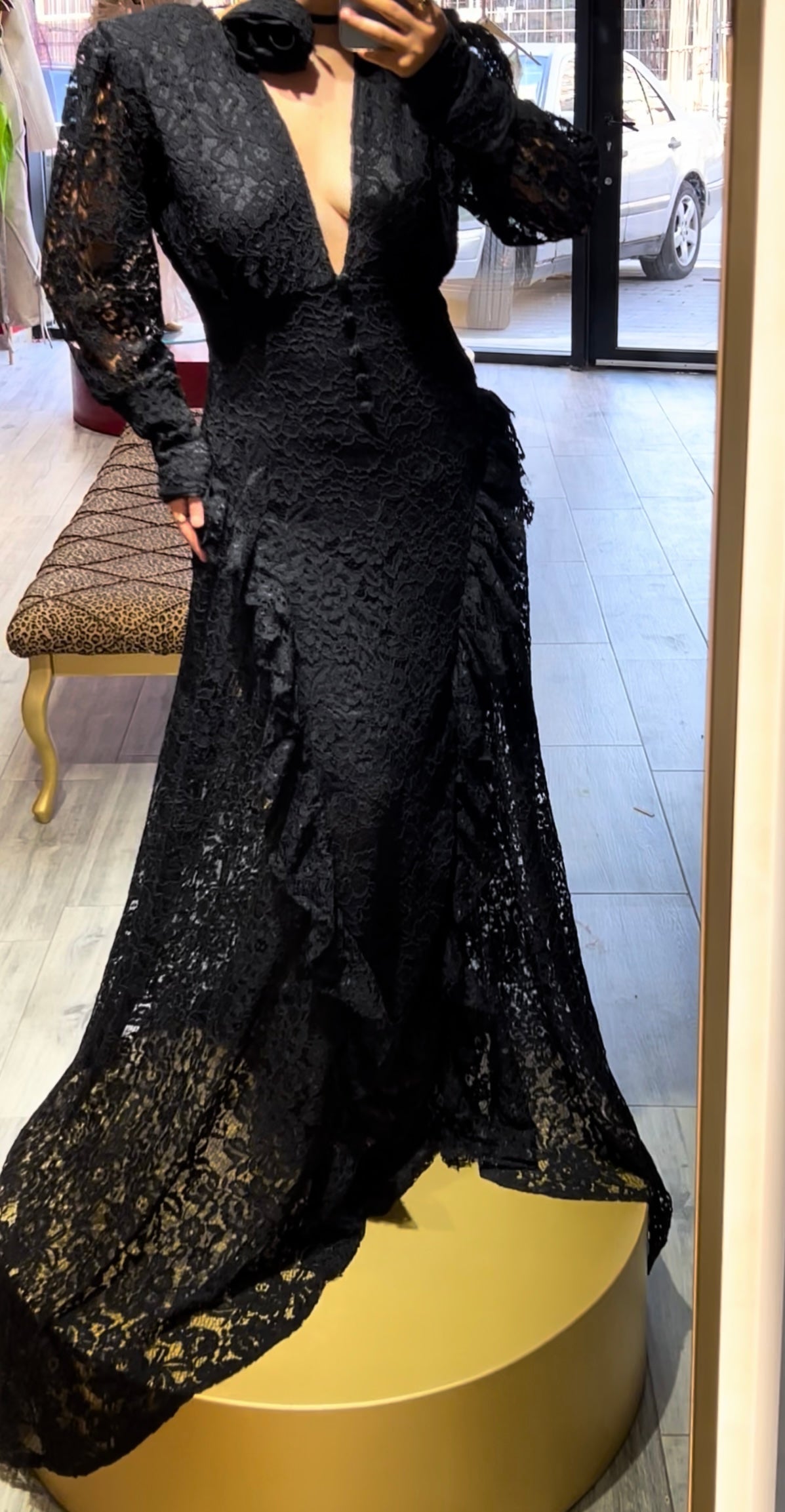 Features long elegant sleeves,  open back and a deep front neckline that can be customized upon request.