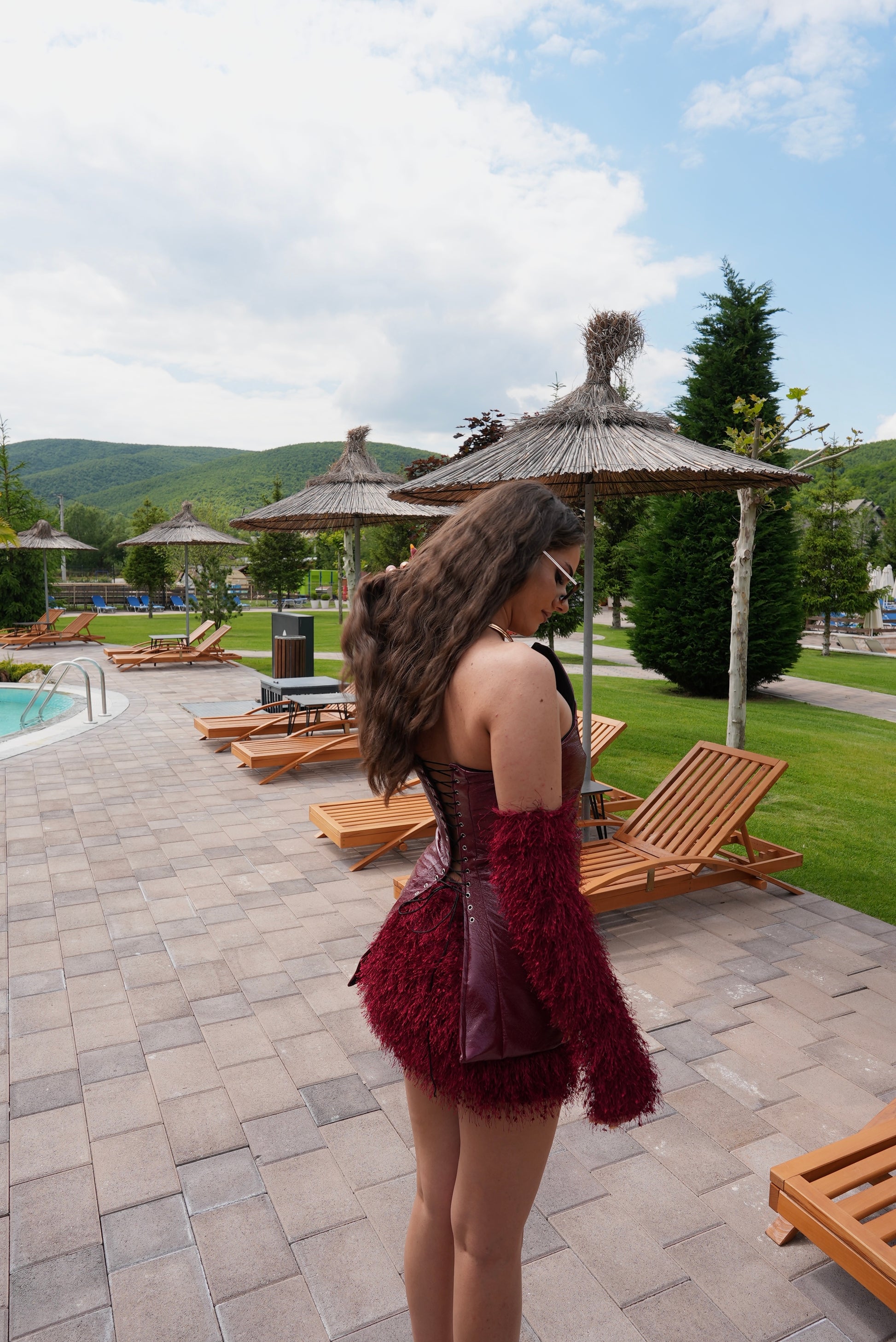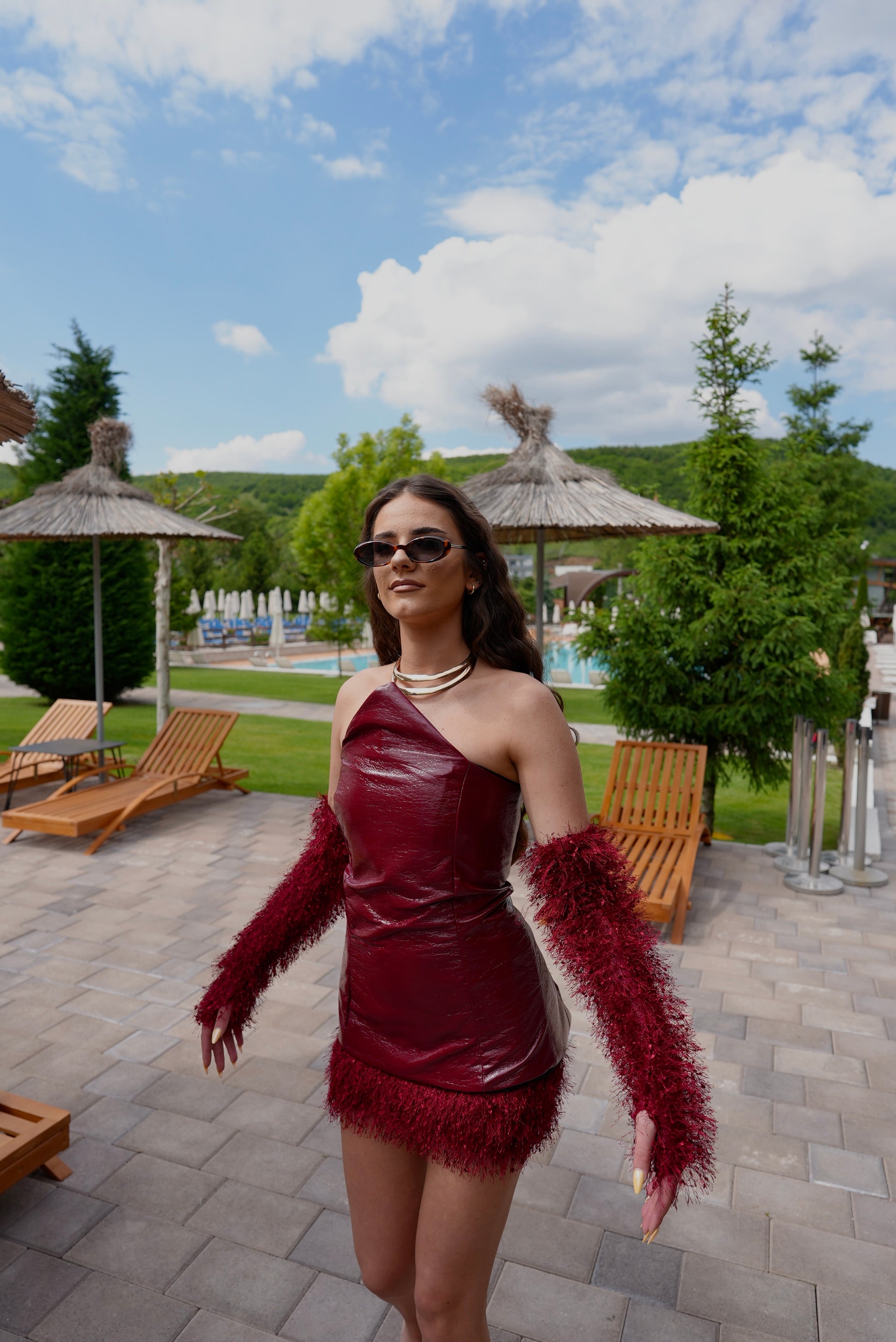 The Cherry Set showcases a unique triangle corset secured with back laces, complemented by a soft, stretchy skirt and coordinating gloves for an exceptional style statement.