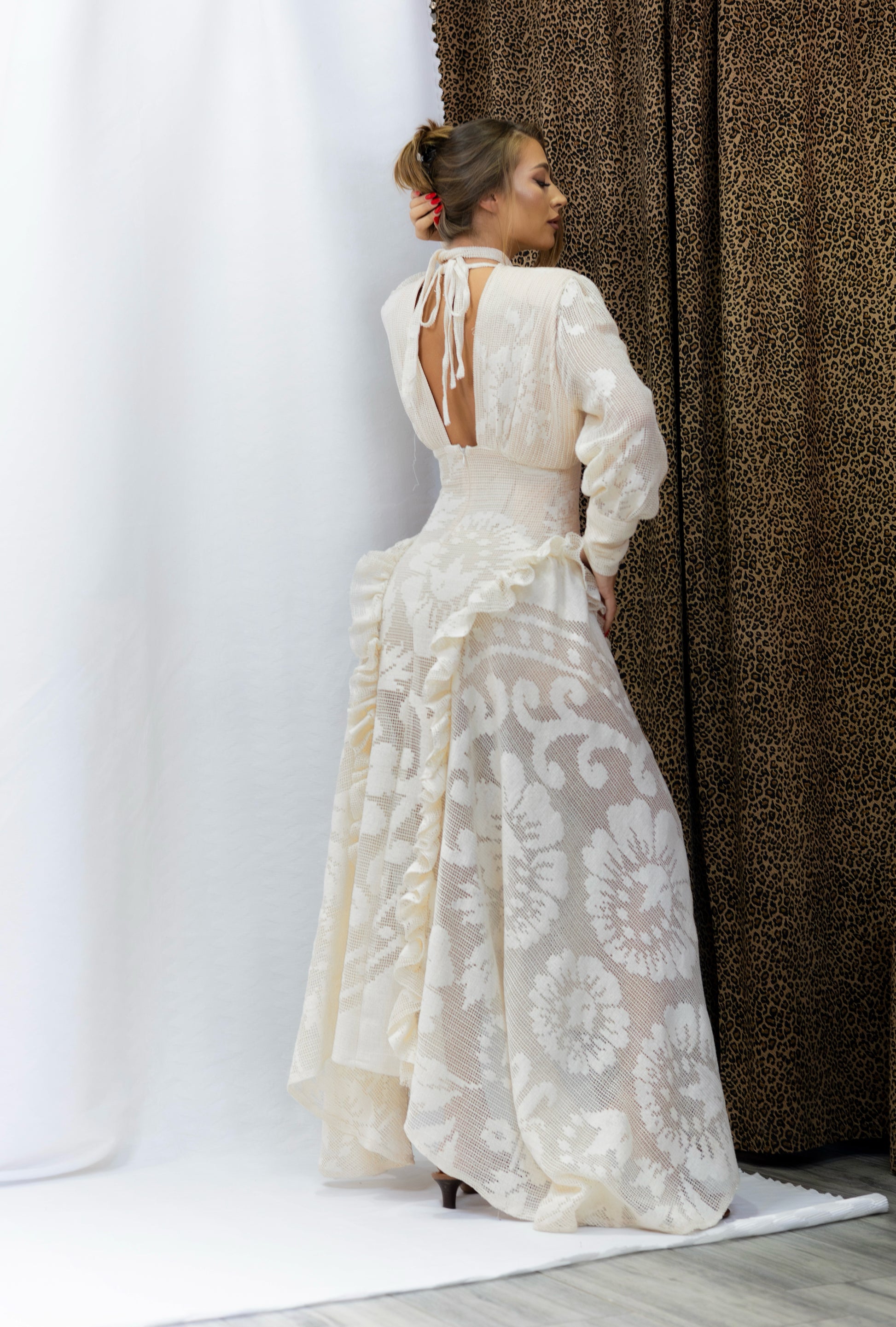 A masterpiece of craftsmanship and elegance. This ivory crochet dress is fully handmade from delicate lace fabric featuring intricate floral patterns that flow naturally with every movement.