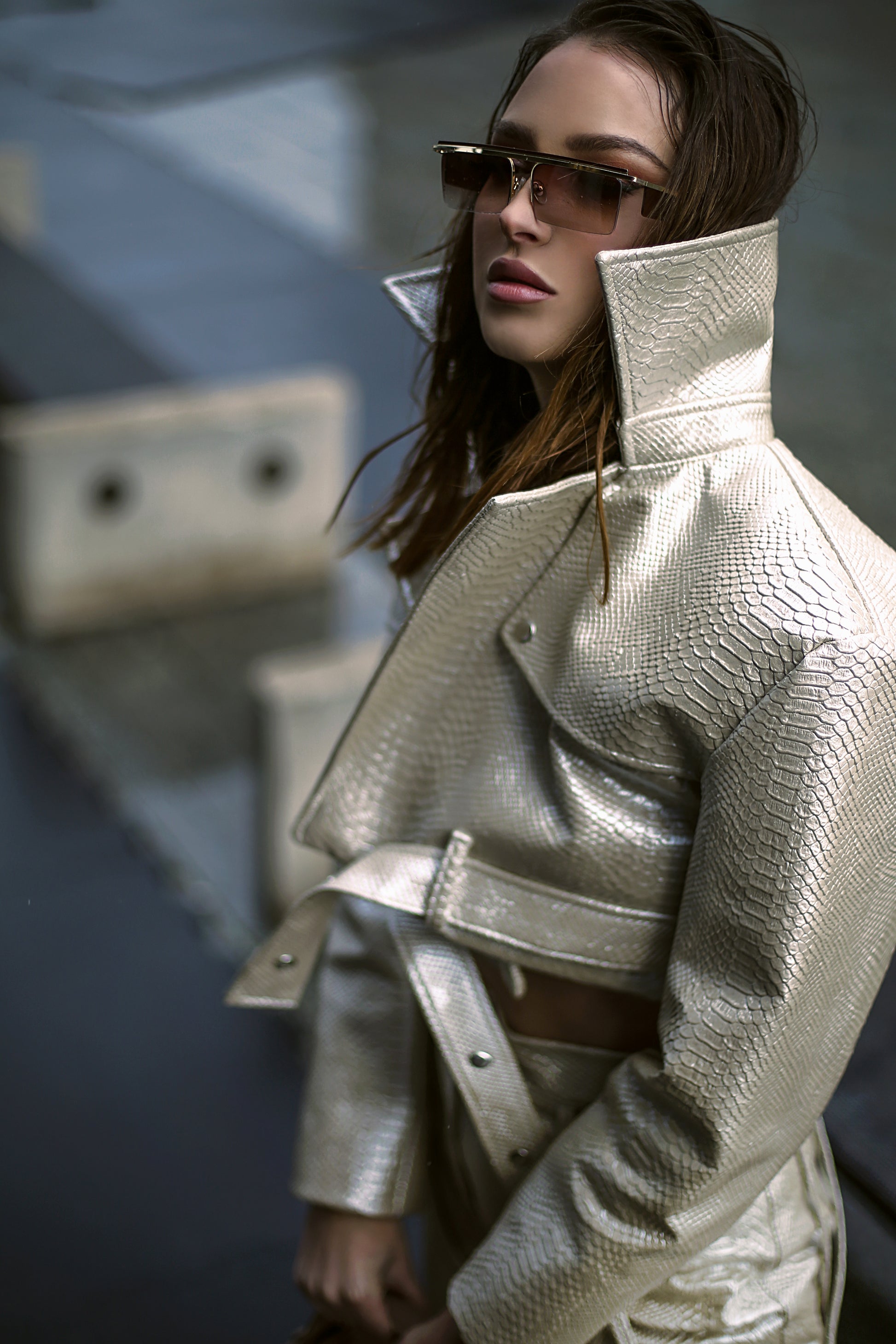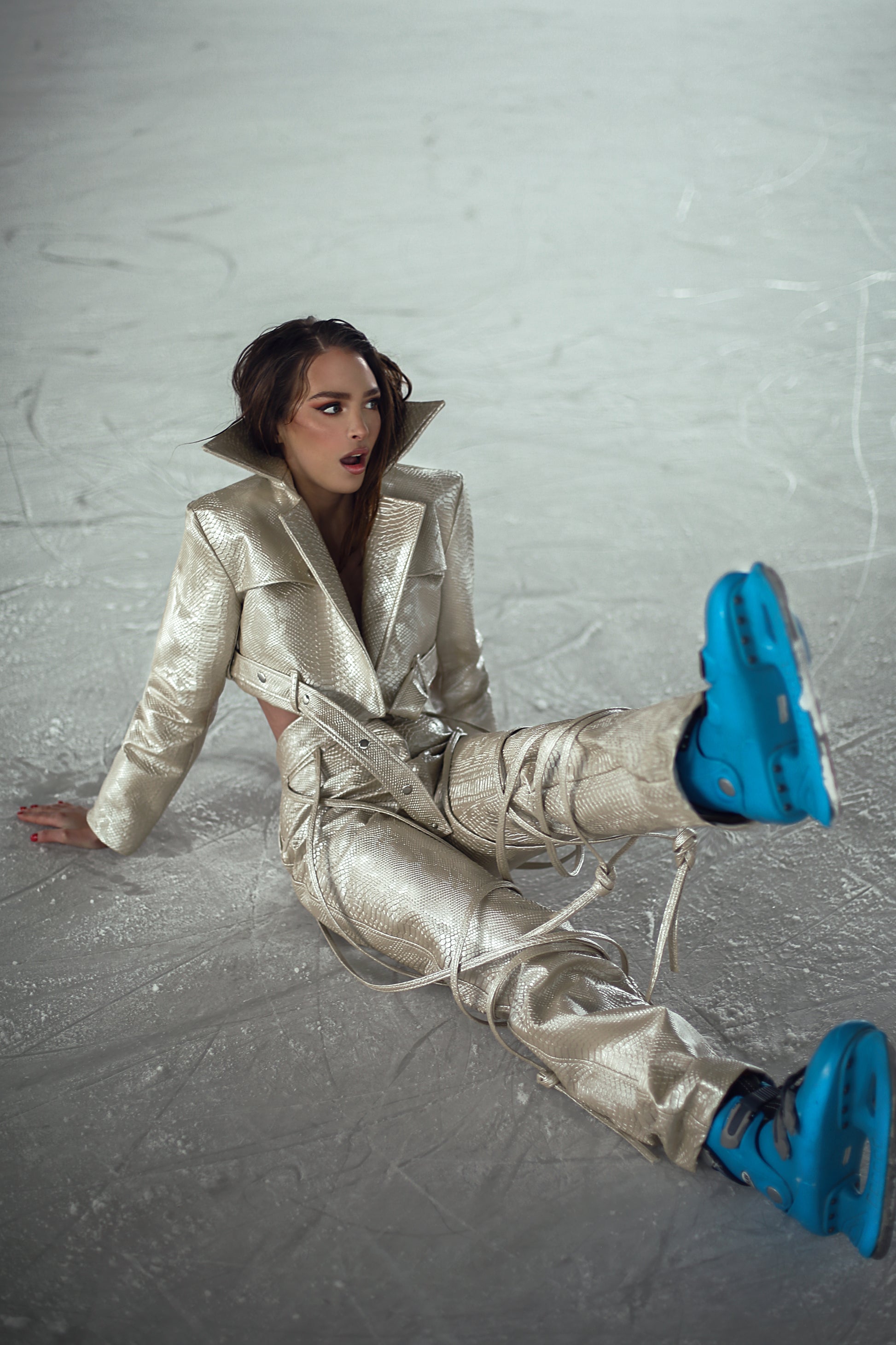 Precision-crafted metallic leather ensemble featuring expertly tailored pants with distinctive lace detailing. Complemented by a sophisticated leather jacket with functional button closure and a structured belt for a refined silhouette.