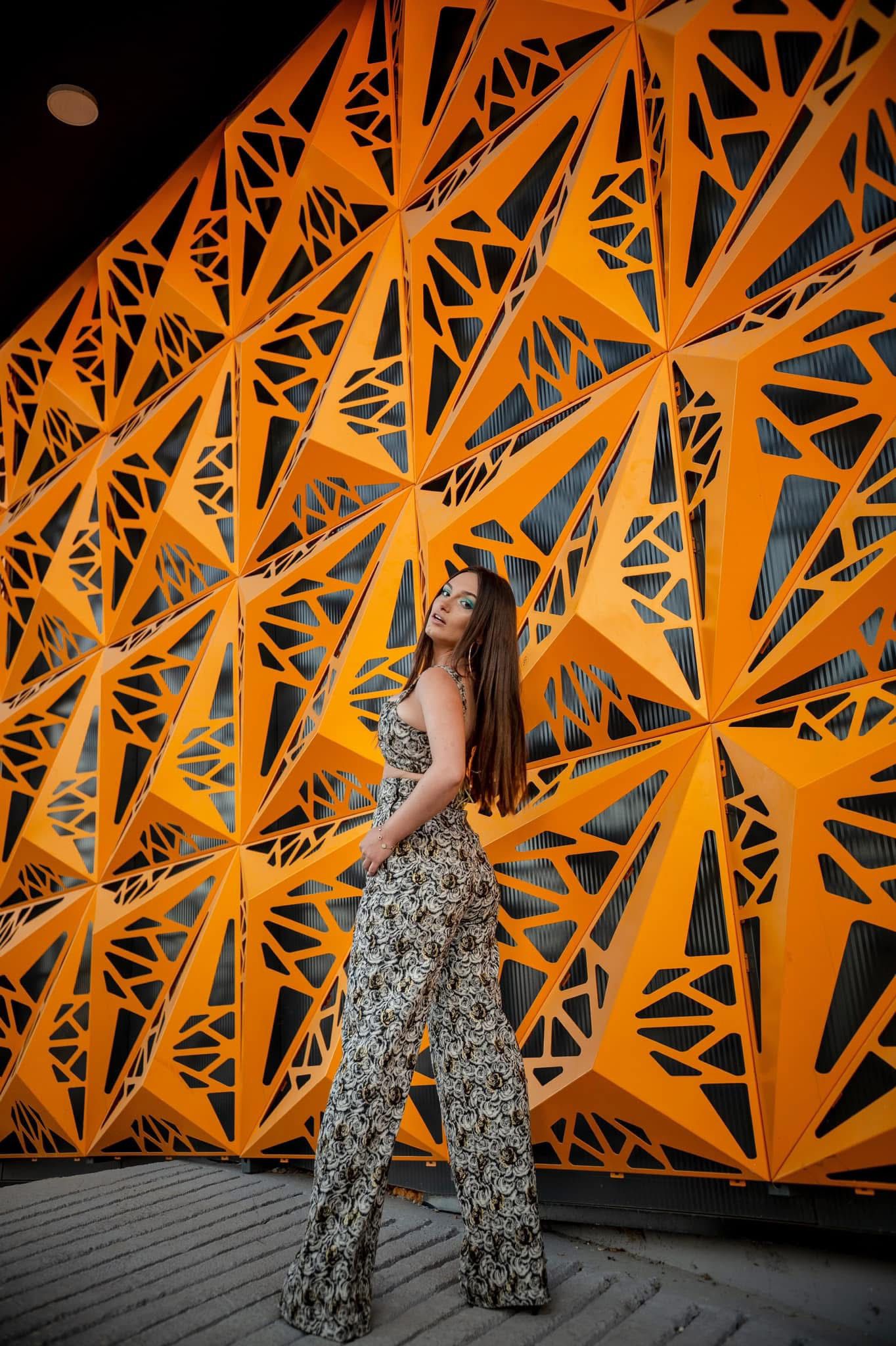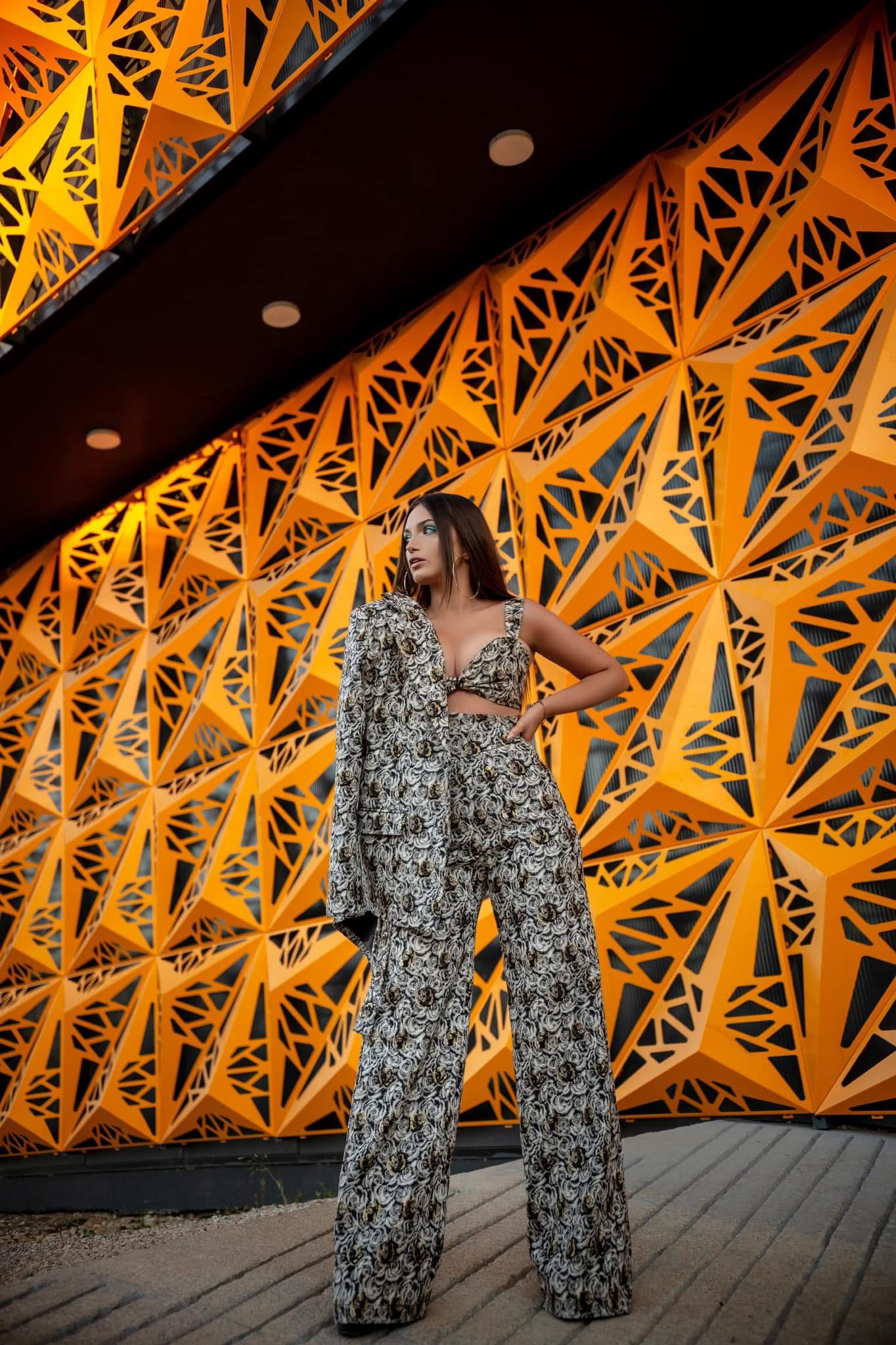 This vintage suit features a flowery design, an oversized blazer with pockets, a heart-shaped corset with laces, and high-waisted straight pants.